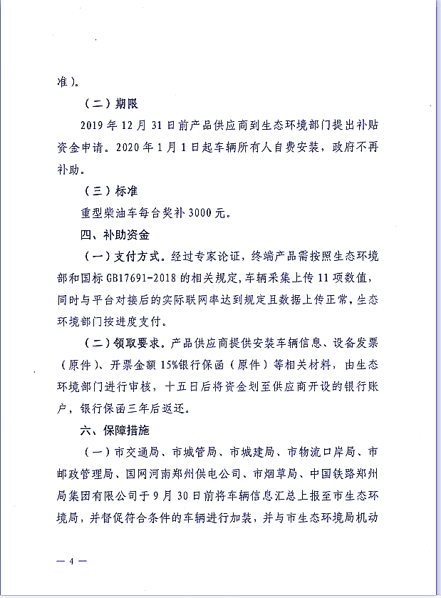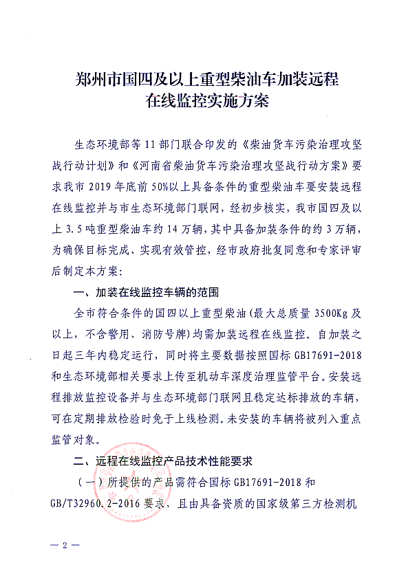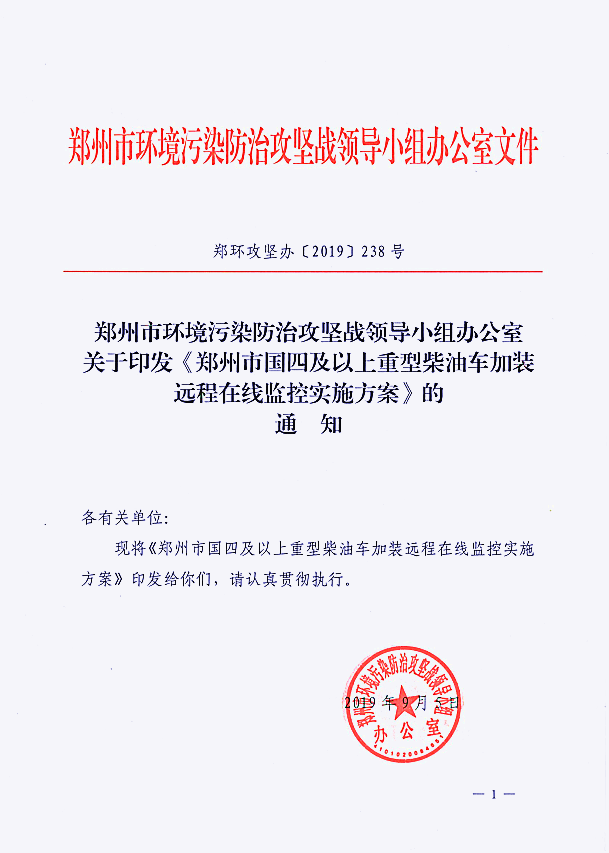 郑环攻坚办【2019】}238号关于,《郑州市国四及以上重型柴油车加装远程在线监控实施方案》通知