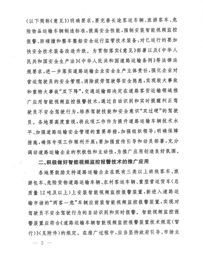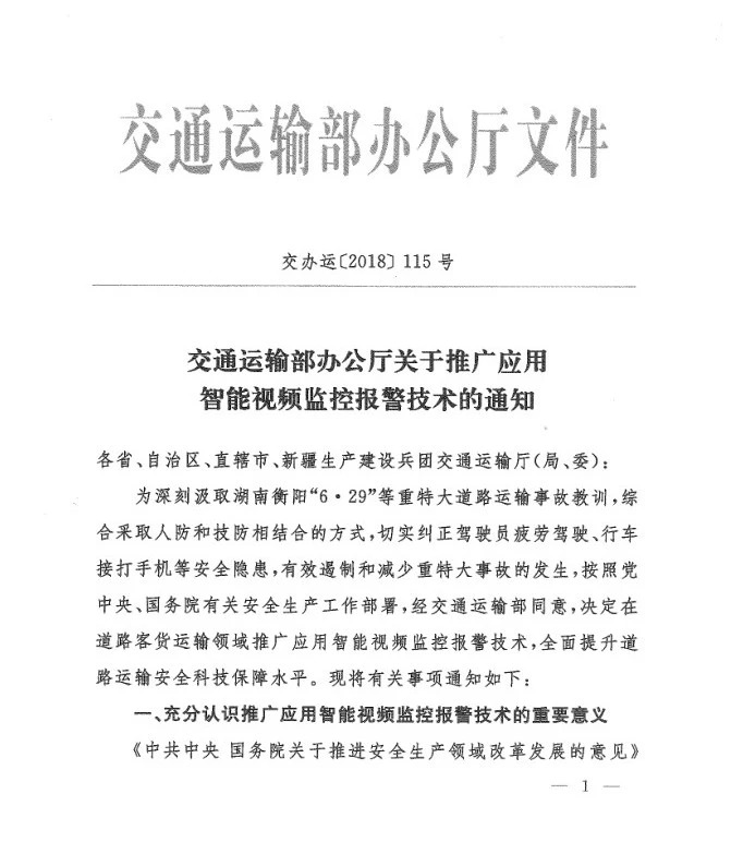 2018年交通运输部办公厅关于推广应用智能视频监控报警技术通知文件:
