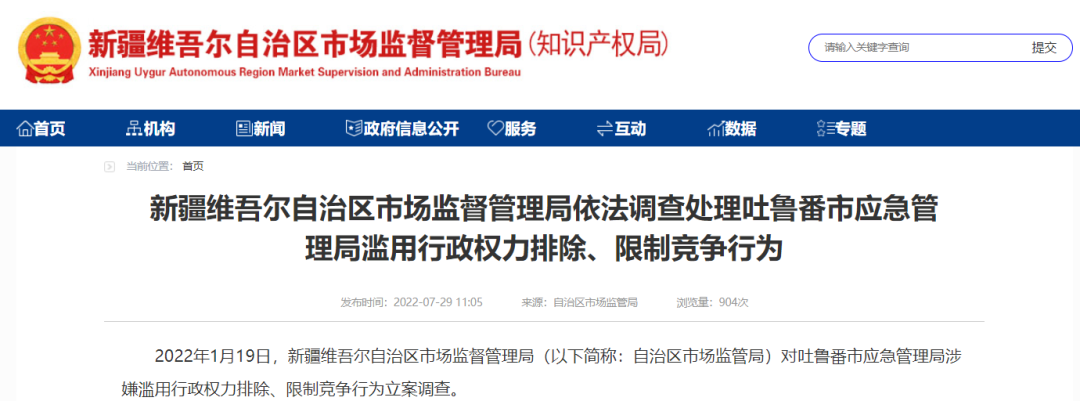 2022年1月19日,新疆维吾尔自治区市场监督管理局(以下简称:自治区市场监管局)对吐鲁番市应急管理局涉嫌滥用行政权力排除、限制竞争行为立案调查。